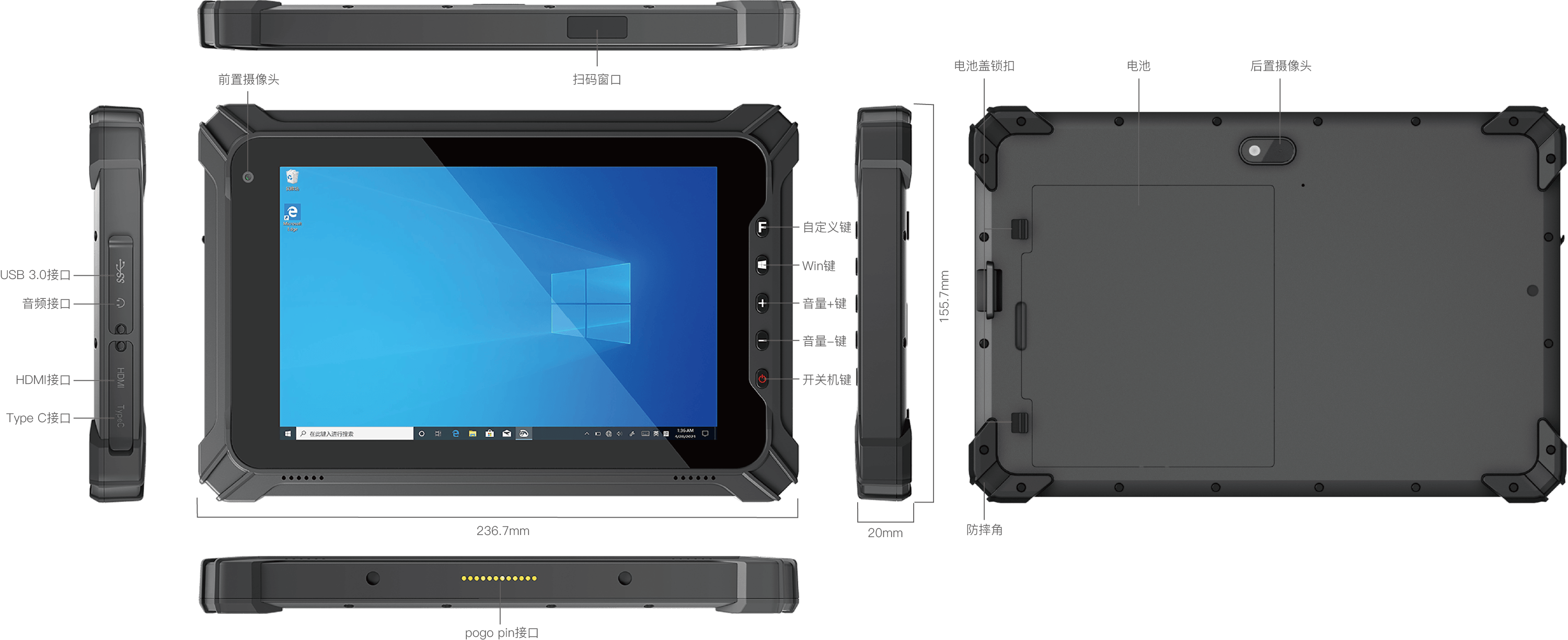 阿普奇TPP-080CQEA是一款工業級手持平板電腦,配備8英寸TFT-LCD顯示屏,分辨率1920×1200,亮度550 cd/m2,支持5點投射電容觸摸,覆蓋鋼化玻璃,硬度≥7H。搭載Intel? Celeron? N5100處理器,8GB DDR4內存,128GB eMMC存儲,支持TF卡擴展。接口包括USB Type-A、Type-C(支持充電)、HDMI Mini、SIM卡槽等。具備前置5MP攝像頭、雙防水揚聲器、G-sensor、Wi-Fi 5雙頻、藍牙5.0、4G LTE、GPS/Glonass,可選NFC和QR碼掃描。采用可拆卸5000mAh電池,運行Windows 10系統,尺寸236.7×155.7×20mm,重量910g,IP65防護,工作溫度-20~60°C,抗振動與跌落,適用于手持及車載場景。